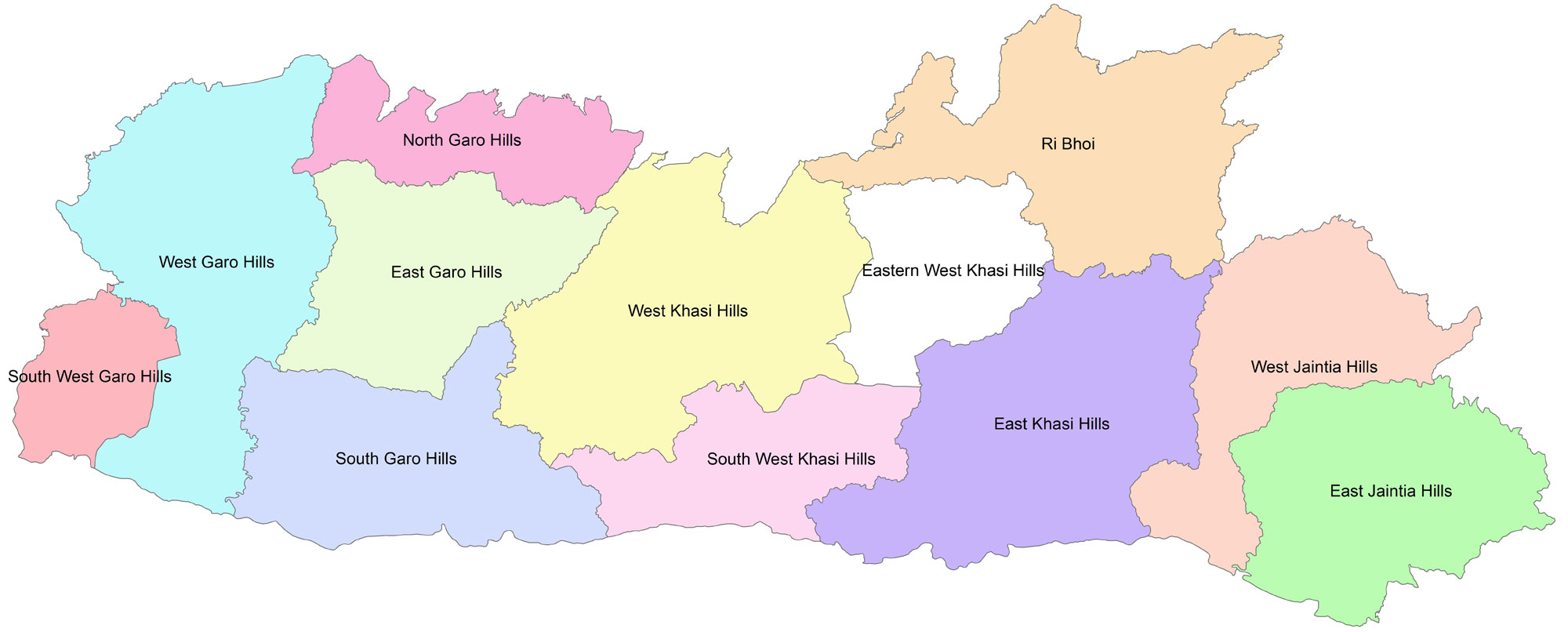 In order to accelerate the pace of development and to bring the administration closer to the people, the State has been reorganized into twelve administrative Districts, namely East and West Jaintia Hills Districts; East, West, South West and Eastern West Khasi Hills Districts, Ri Bhoi District and North, South, East, West and South West Garo Hills Districts.