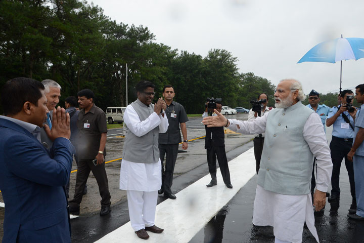 Prime Minster Narendra Modi being received by Dr.Mukul Sangma, Chief Minister of Meghalaya, V.Shanmuganathan, Governor of Meghalaya and other dignitaries at the ALG, Upper Shillong on 27-05-16